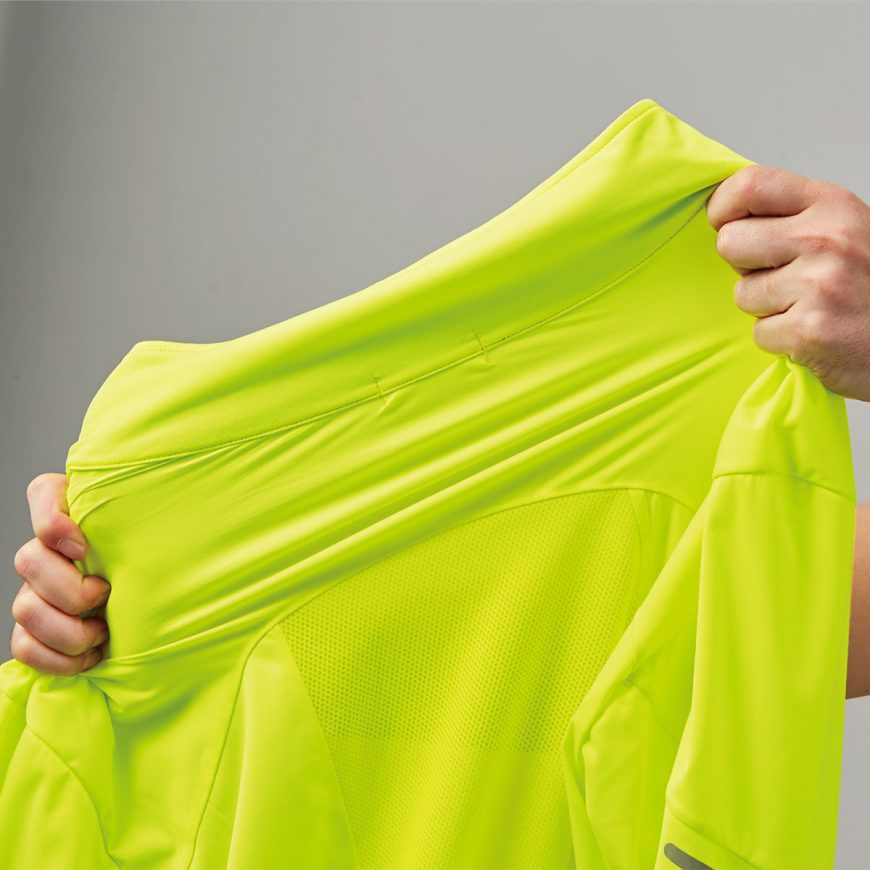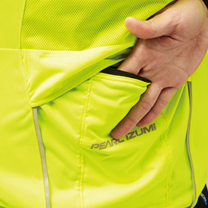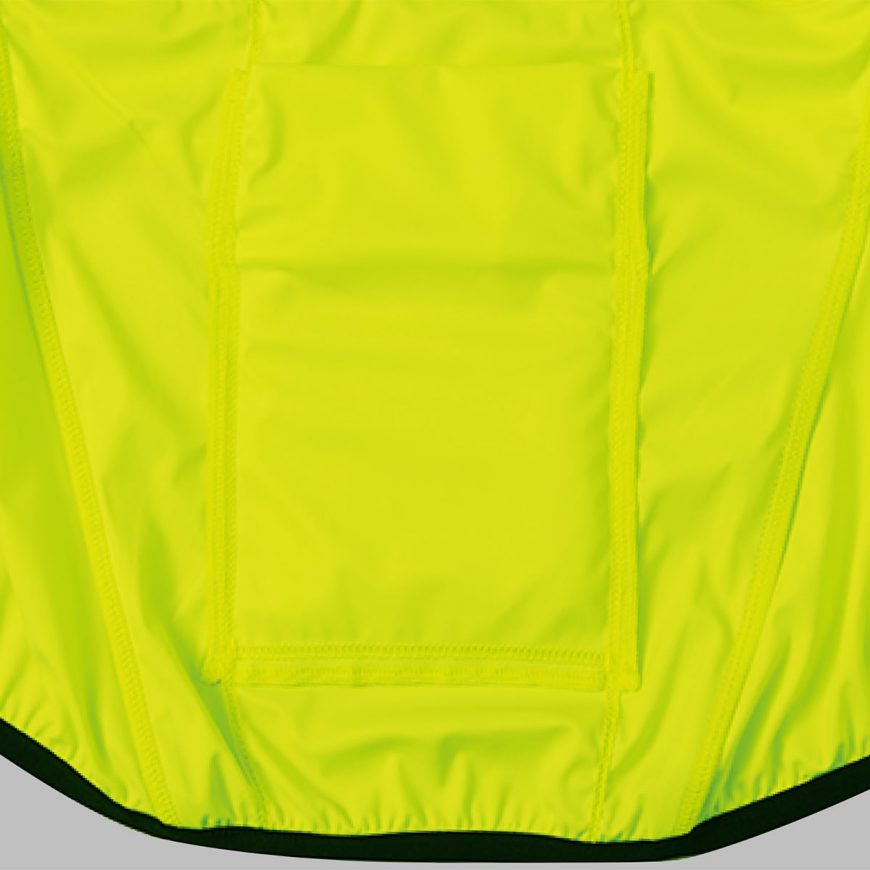 天候の変化による寒さや山の下りで風を正面から受ける時などに、威力を発揮します。ポケッタブルでコンパクトに収納できるので携帯に便利なアイテムです。身体にぴったりとフィットしながらもストレッチ素材のため動きやすく、風によるバタつきも抑えます。背中はメッシュで通気性に優れ、撥水加工により小雨程度の水は弾きます。