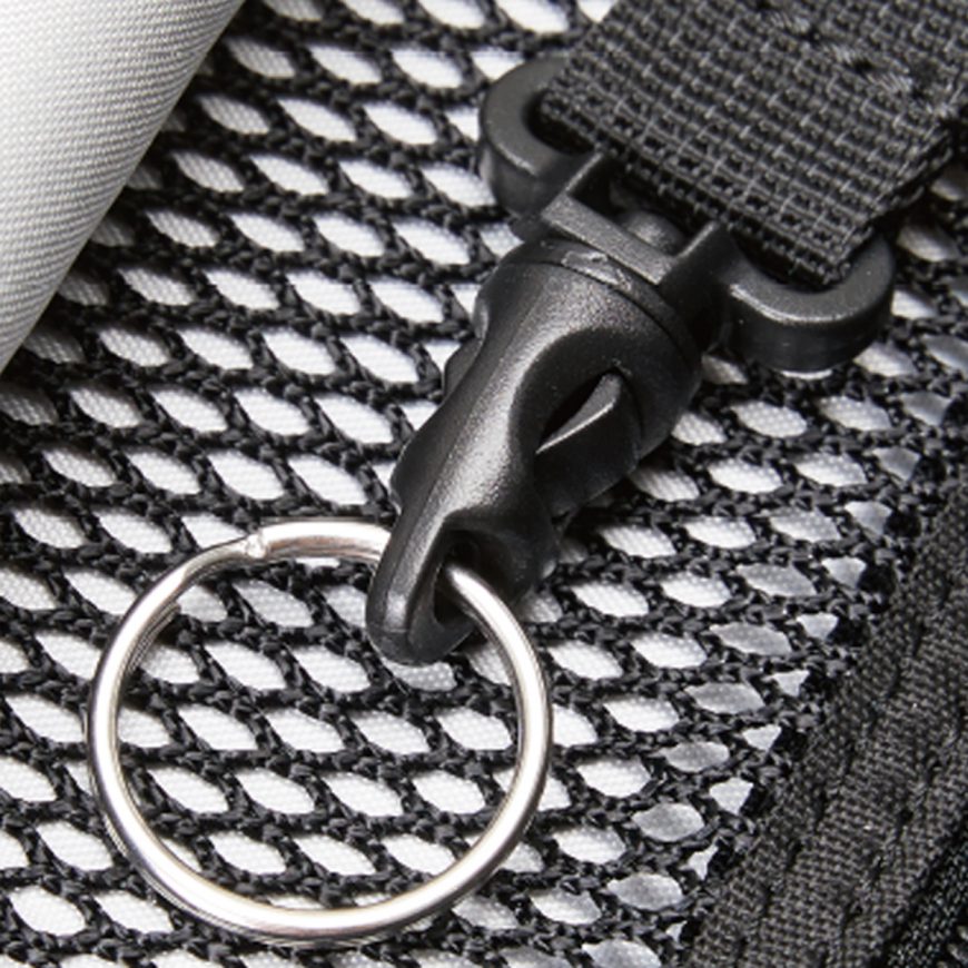 内部のメッシュポケットに鍵などをつけられる、取り外し式キーフック付き