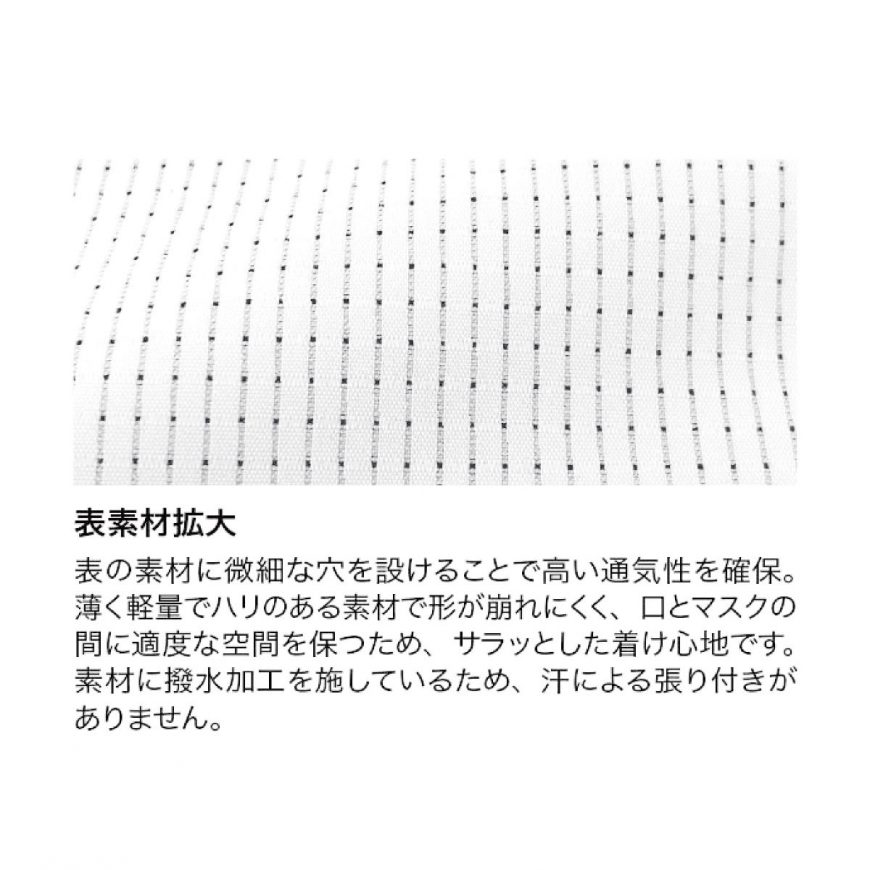 素材の表面に微細な穴を設けることで通気性を高め、夏場でもムレにくく、洗ってもすぐに乾くので毎日清潔にお使いいただけます。ホワイト、グレー、ネービーの3色をご用意していますので、仕事やプライベート、様々なシーンでご利用いただけます。付属品としてマスクのポケットに挟み込むための生地も同封しています。