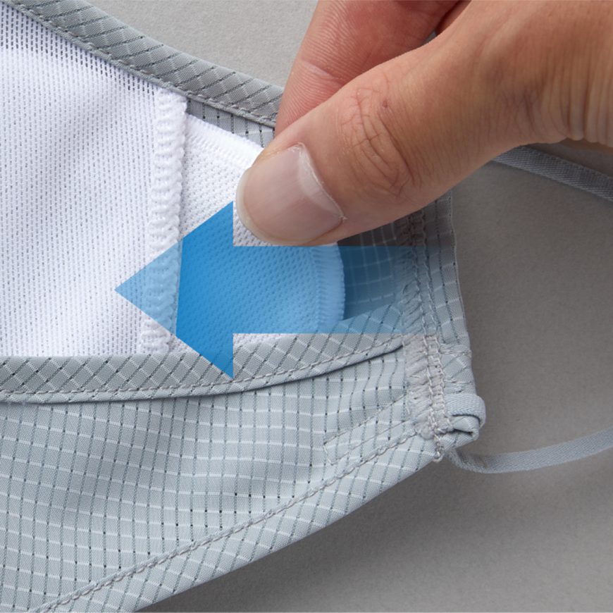 口部分が大きく開く仕様になっているため、呼吸を妨げず、不快なムレを積極的に開放します。 耳にかけるゴムにはアジャスターが付いているので、長さが調節でき、耳も痛くなりにくく、長時間お使いいただくことができます。サイズは2サイズご用意していますので、女性にもぴったりフィットします。付属品としてマスクのポケットに挟み込むための生地も同封しております。