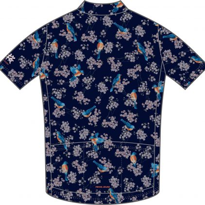 桜の小花柄と、幸せを運ぶ青い鳥「瑠璃鶲(るりびたき)」を、春に映えるシックなデザインに仕上げました。男女問わずシーズンを通して着られるので、海外の方へのプレゼントにも最適です。