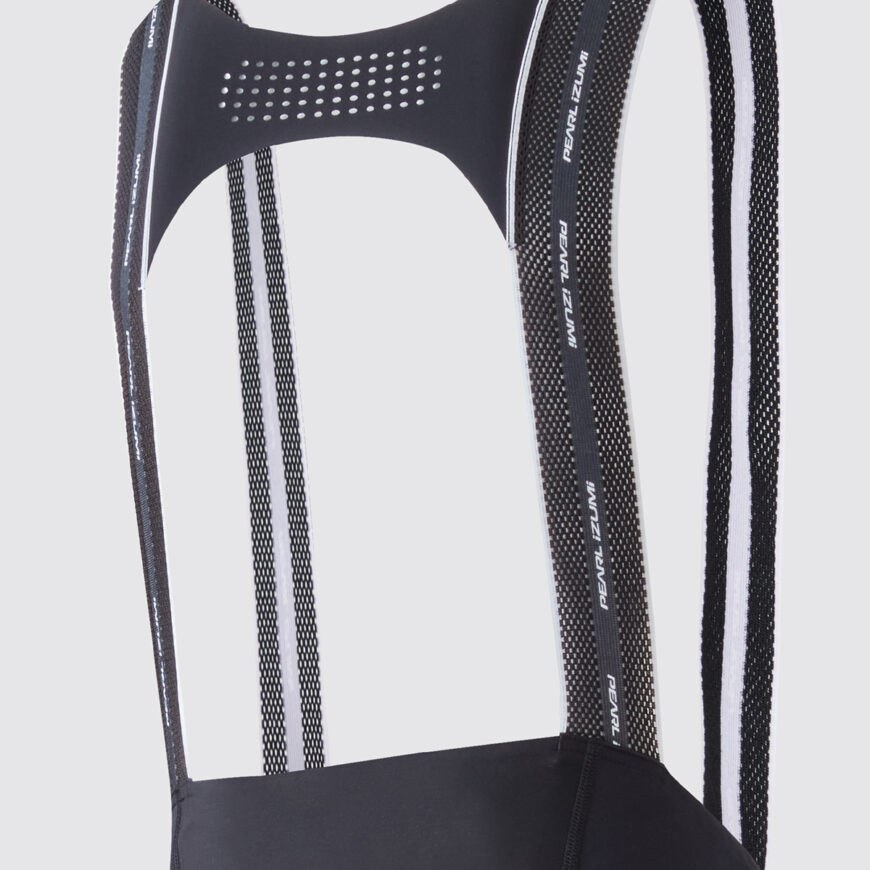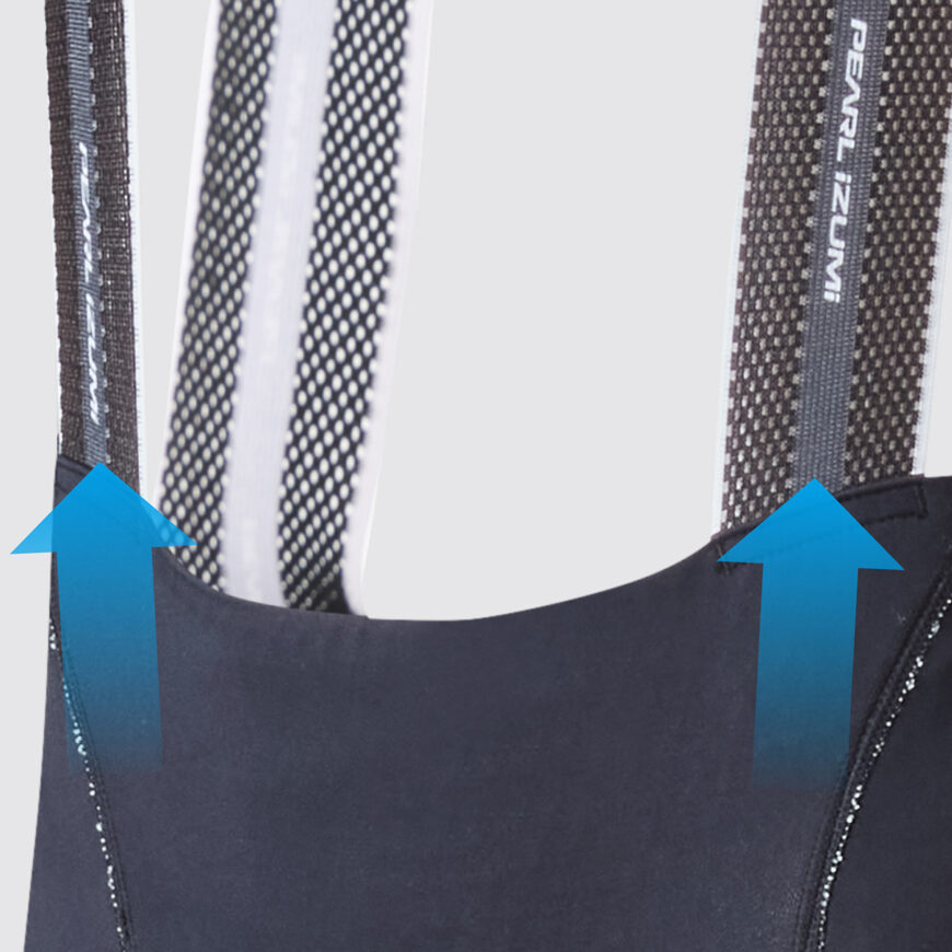 ストラップの縫い付け位置により、パッドを上へ引き上げフィット感を高める特殊ビブ付設計