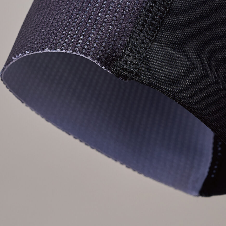 ジャージ身頃素材の通気性を活かす、メッシュに編み分けられたビブバンド