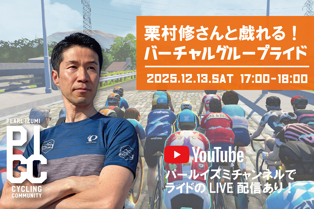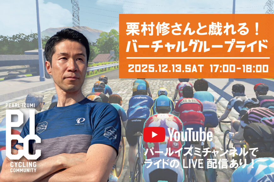 今回はパールイズミのアンバサダーであり、国際レースオーガナイザーや自転車レースの解説などでもおなじみの栗村修さんをゲストにお迎えし、屋内サイクリングアプリ「Zwift」を使ったバーチャル空間でのグループライドを1時間行います。