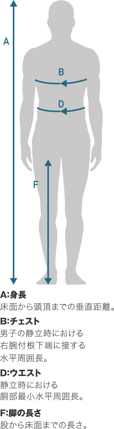 | サイズ | A:身長 | B:チェスト | D:ウエスト | F:脚の長さ |